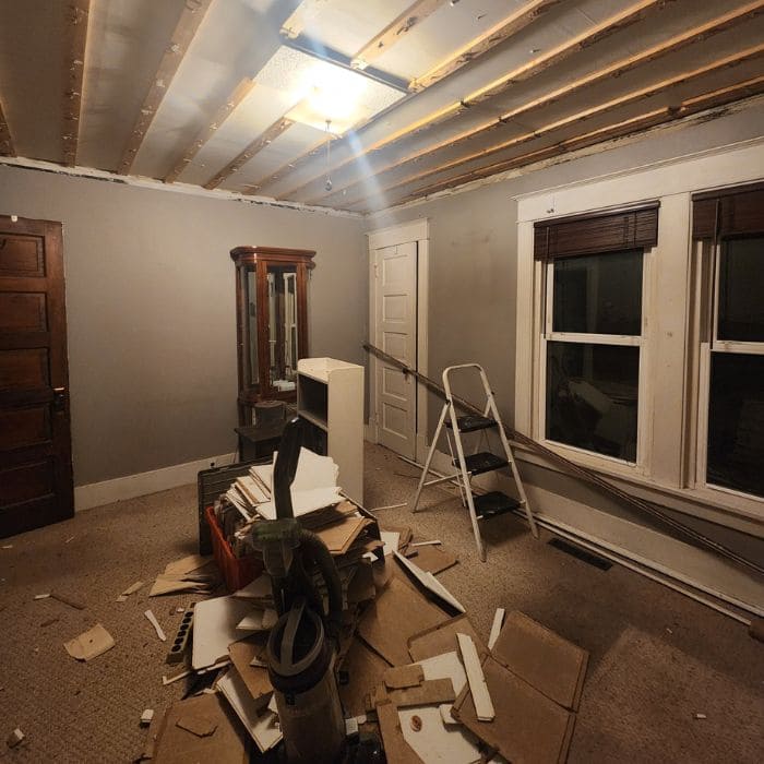 Once the tiles came down, the ceiling revealed itself to be uneven in the subtle, maddening way that only old houses can manage.