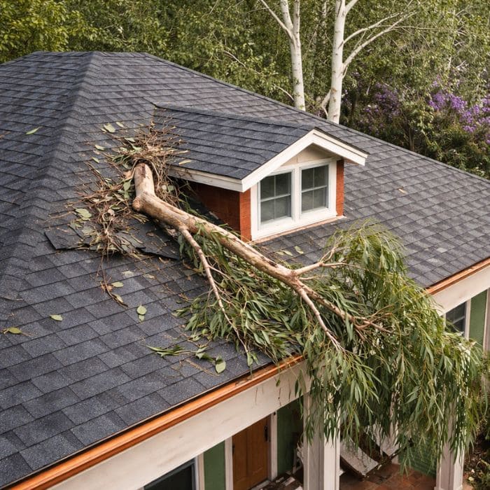 At approximately 2:30 a.m., one of the rear Eucalyptus trees failed at the roots. The ground, saturated and softened, gave way, and the tree came down directly onto the back portion of the roof.