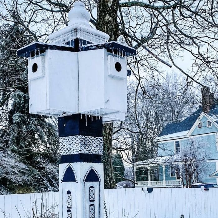 The birdhouse he built years ago, a tall, hand-painted structure shaped like a lighthouse, wore a crown of ice so heavy it bowed the post slightly.