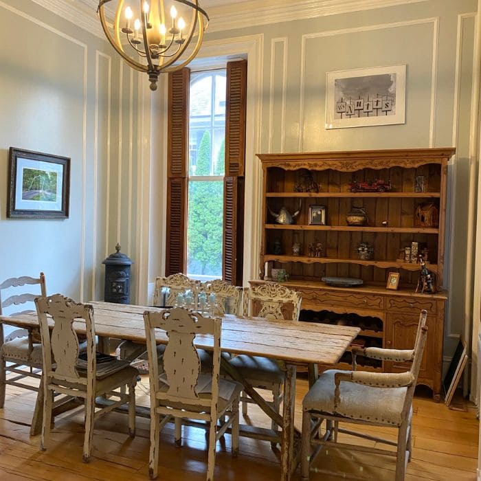 The dining room sits just off the hallway, tall and bright, with paneled walls that frame the space without overpowering it.