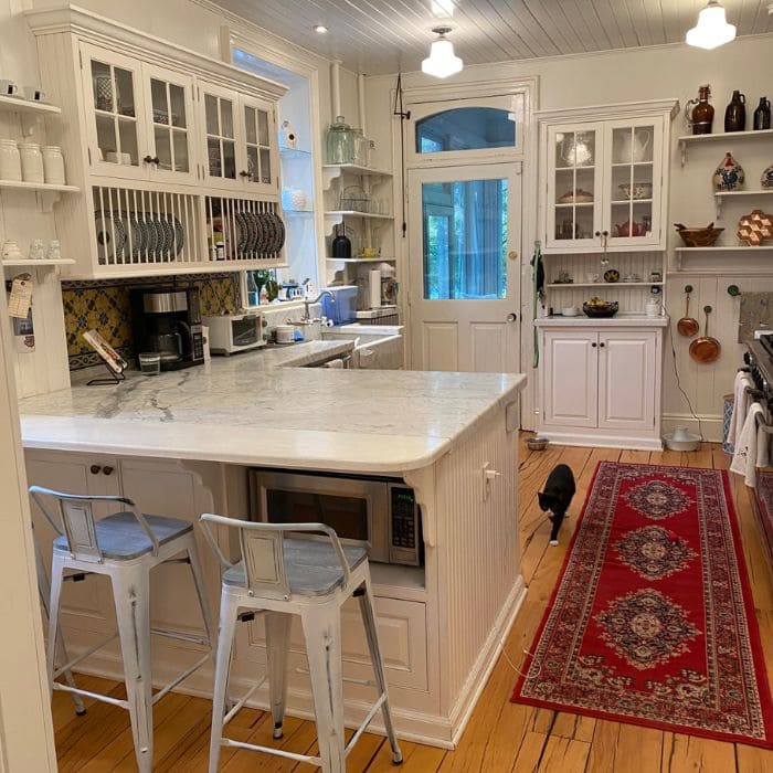 Copper pots hang along one wall, not arranged for effect but because they’re used. The beadboard ceiling is clean and thoughtfully installed, acknowledging the past without attempting to recreate it.