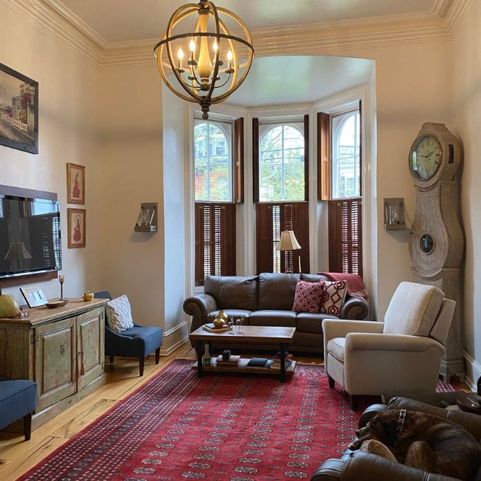 The living room opens to the left, and it immediately feels balanced, as though the room understands its role in the house. Tall windows line the wall, each framed by original wooden shutters that still move smoothly, even after more than a century of use.