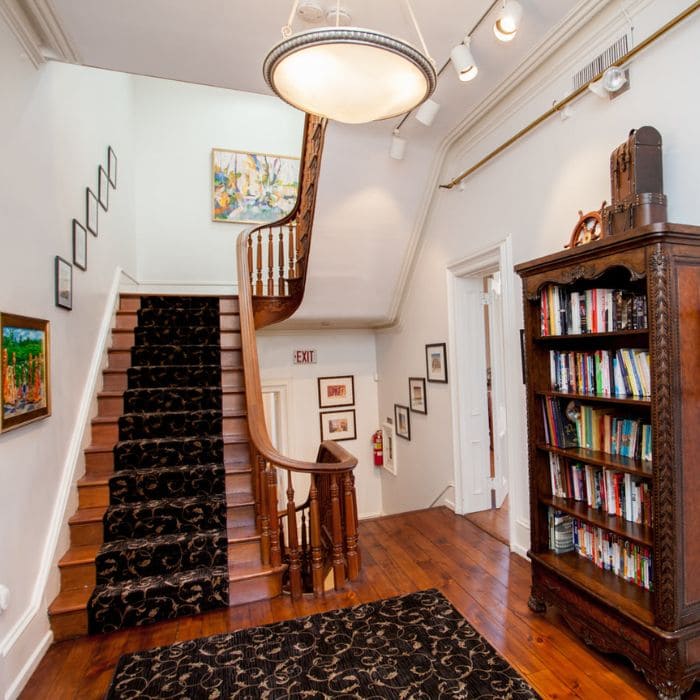 The staircase curves upward with a grace that modern homes rarely attempt. The banister is smooth from years of hands sliding along it, and the steps dip ever so slightly in the center, shaped by habit rather than neglect.