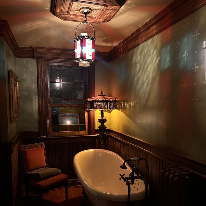 Light interacts beautifully with the green walls, the wood trim, and the curved surface of the tub, creating a space that feels intimate rather than confined.