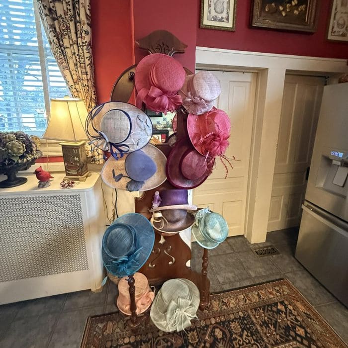 One corner held a wooden hall tree covered with elegant hats in shades of rose, navy, teal, and ivory.