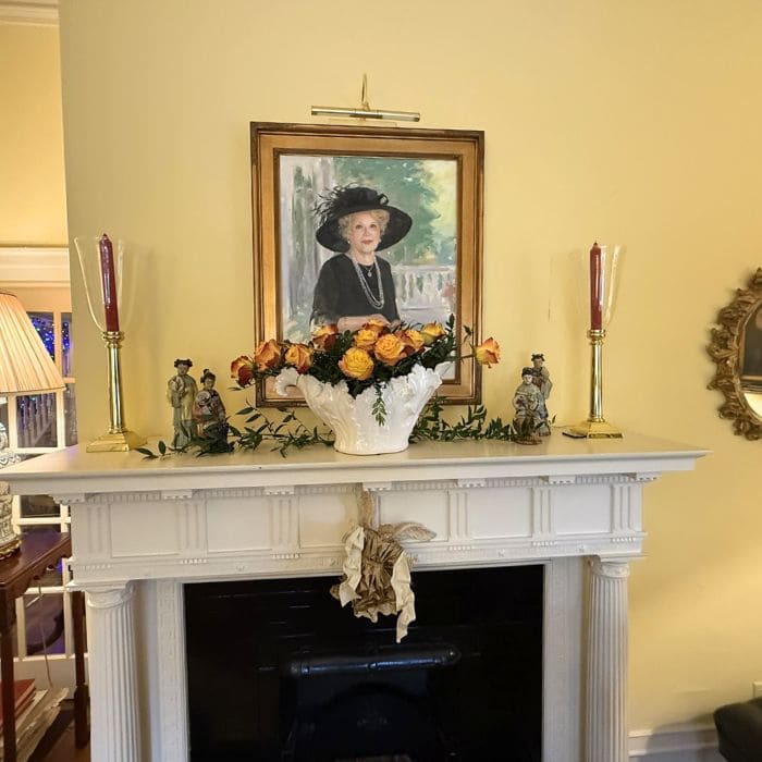 In the parlor, above a white fireplace mantel, hangs a portrait of Barbara. She is wearing a wide-brimmed black hat and layered pearls, her expression poised and warm.