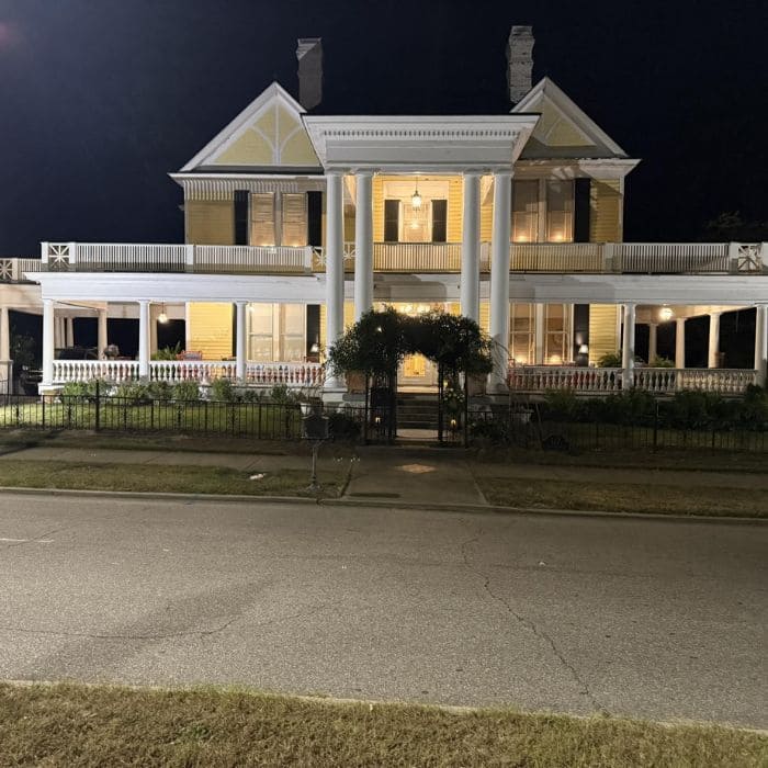 The house stands confidently, symmetrical and dignified, with architectural lines that speak of the late nineteenth century. Built in 1885, it carries that refined Southern elegance without feeling stiff or distant.