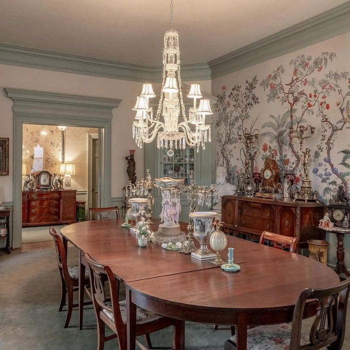 Original trim and crown molding framed the room, and a crystal chandelier installed as an anniversary gift decades ago hung low enough to feel present without dominating the space.