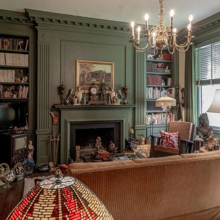 Built-in shelves painted a deep green framed the fireplace wall, installed in the late 1930s after the original owners grew tired of freestanding cabinets shifting with the seasons.
