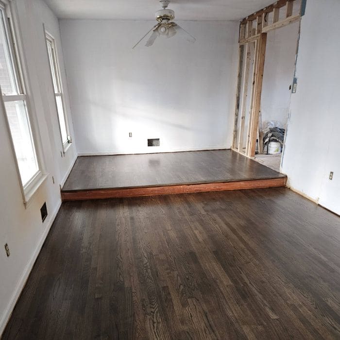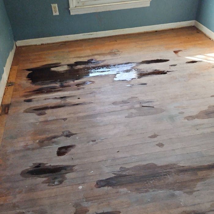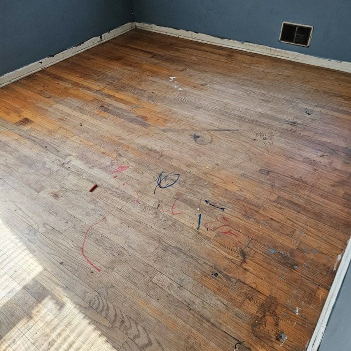 There were scratches from furniture being dragged, dull areas where foot traffic had worn the finish away, and rooms where the floor had lost its color entirely and looked gray and thirsty.
